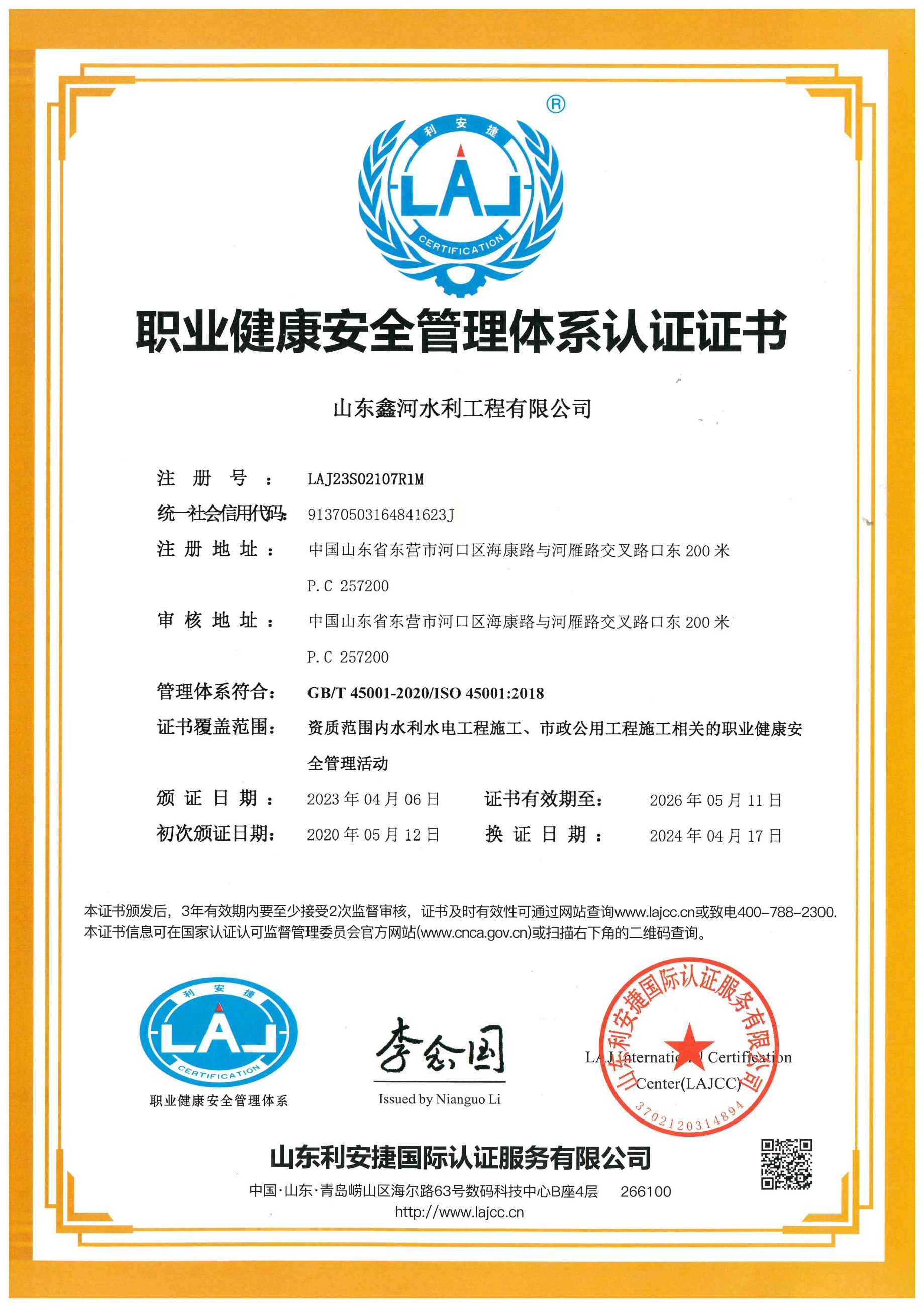 職業(yè)健康安全管理體系認(rèn)證證書